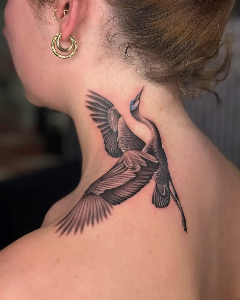 This stunning tattoo features a blue heron in mid-flight, gracefully positioned from the neck down across the shoulder. Rendered in fine black and gray shading with a soft touch of blue around the eye, the bird’s wings are beautifully fanned out, capturing both motion and elegance.