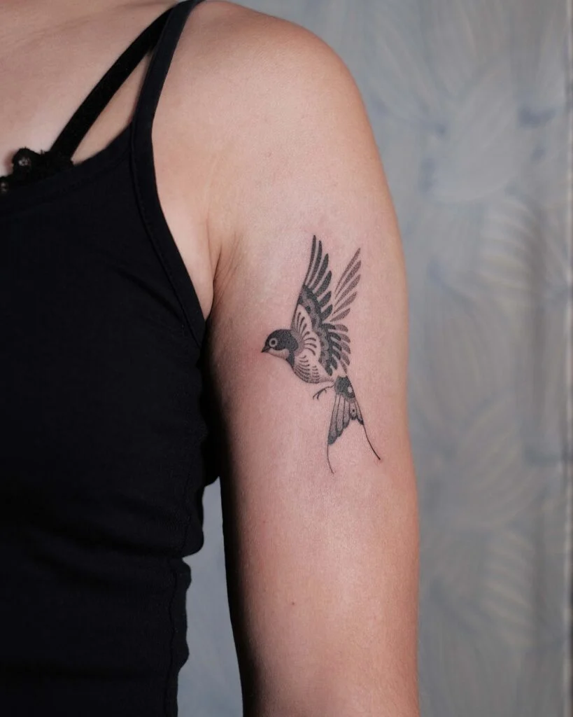 This striking blackwork tattoo features a swallow-like bird captured mid-flight on the back of the upper arm. The design uses bold lines and solid shading to highlight the bird’s outstretched wings and graceful tail feathers.