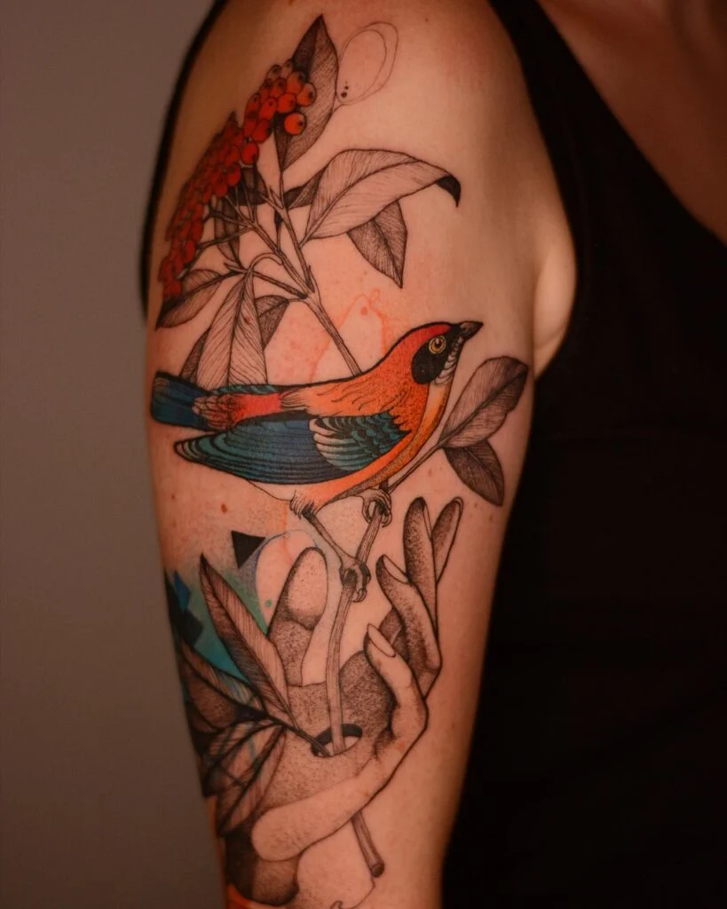 This artistic upper arm tattoo showcases a vivid orange and blue songbird perched on a branch, surrounded by lush botanical elements and an elegantly drawn hand.
