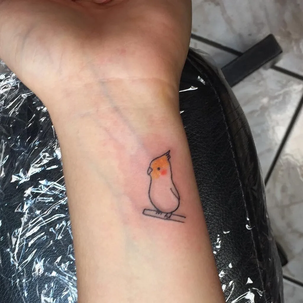 The use of subtle color gives it a cheerful personality without overwhelming the small size. Ideal for bird lovers or anyone who cherishes a beloved pet cockatiel, this tattoo brings a playful and affectionate touch to the wrist.