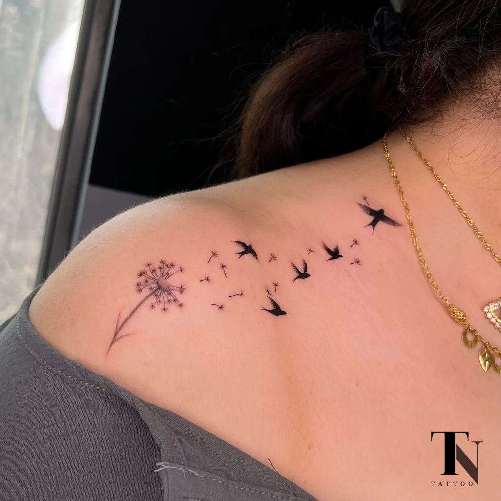 This graceful shoulder tattoo begins with a softly detailed dandelion, its seeds transforming into a flock of flying birds as they drift upward. The transition from delicate seed to bold silhouette creates a poetic image of freedom, change, and letting go.