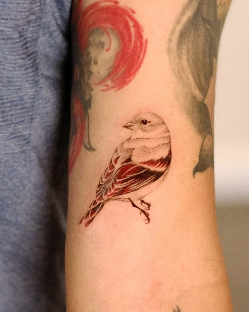 This stunning forearm tattoo features a goldfinch rendered in warm, earthy hues with intricate detail. The bird’s feathers are beautifully layered in soft whites, browns, and deep russet reds, giving it a lifelike, painterly effect.