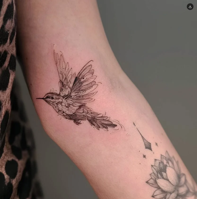 Its placement on the inner arm adds an intimate feel, while the small speckles and flow lines around the bird enhance its movement. Often symbolizing joy, resilience, and freedom, this hummingbird tattoo is perfect for those who value elegance and meaning in a subtle, artistic expression.
