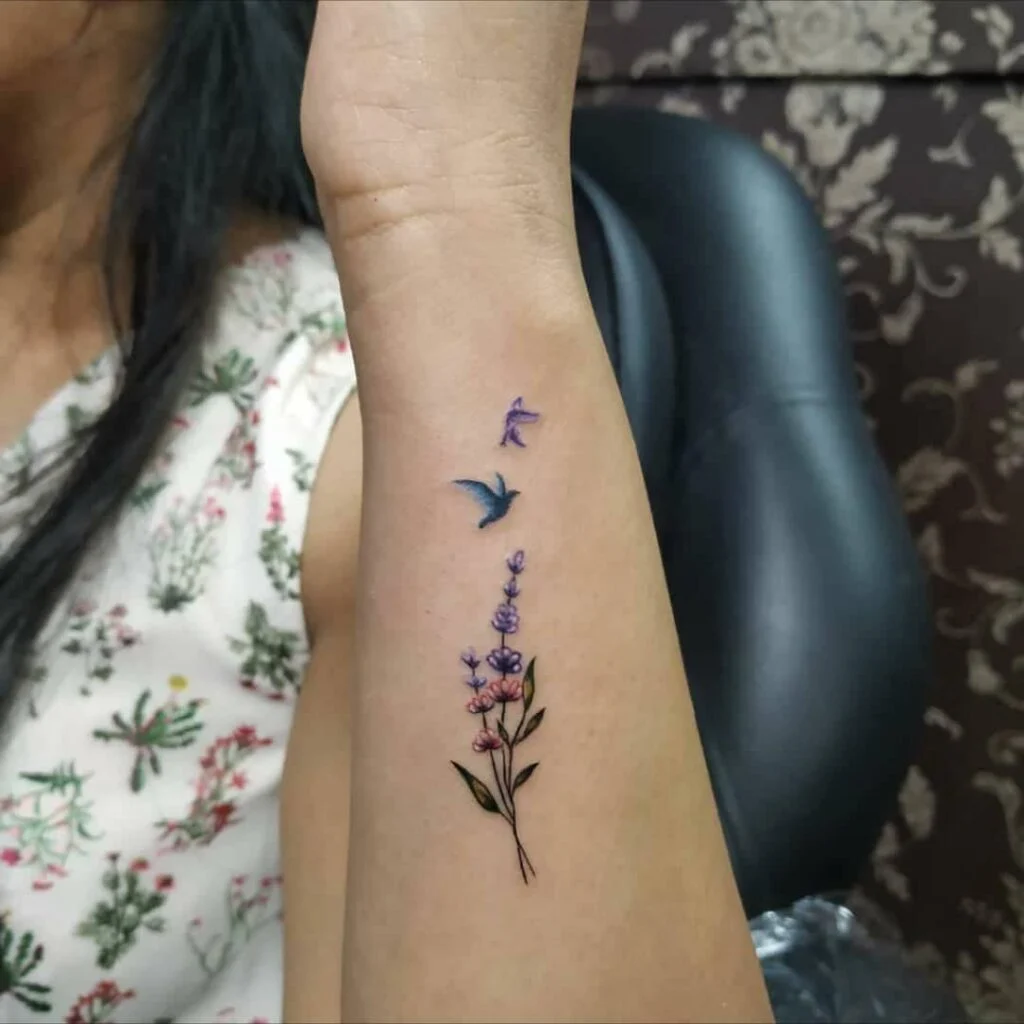 This beautifully detailed wrist tattoo features a small sprig of lavender accented by pink blossoms, rising gently up the arm. Above the florals, two tiny birds in soft purple and blue hues fly upward, adding movement and a sense of freedom to the design.