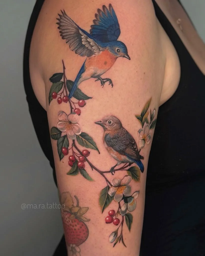Their rich blue and warm orange feathers are rendered with soft gradients, bringing the birds to life. Surrounding them are delicate white blossoms and bright red berries, adding vivid natural detail. Symbolizing hope, happiness, and love, this eastern bluebird tattoo feels both serene and joyful—perfect for nature lovers.