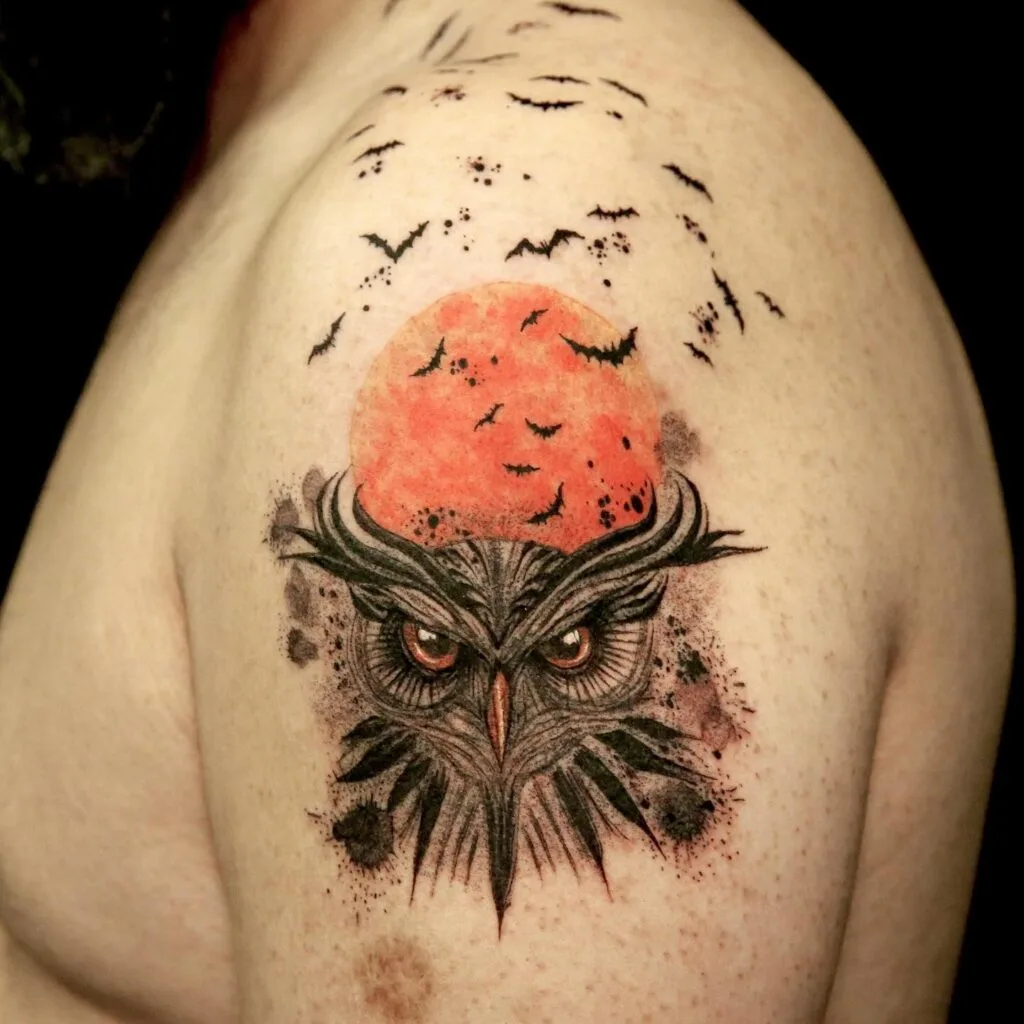 This bold shoulder tattoo features a fierce owl with piercing eyes set beneath a vivid orange moon. The owl’s stylized feathers and intense gaze add a sense of mystery and power, while the moon is surrounded by a flurry of bats in flight, extending across the upper shoulder and back.