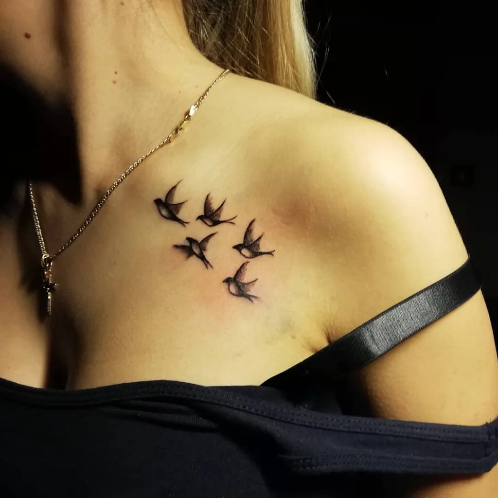 This elegant collarbone tattoo features five small swallows in flight, captured in soft black and grey shading. The birds are arranged in a gentle arc, suggesting motion and freedom, and their placement across the collarbone enhances the natural curve of the body.