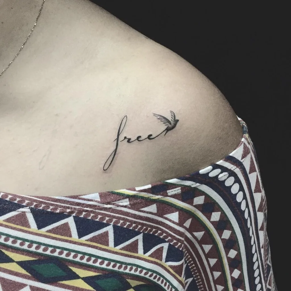 This minimalist collarbone tattoo elegantly combines the word “free” in flowing script with a small bird soaring from the end of the lettering. The fine-line style gives the piece a soft, delicate feel while symbolizing liberation, self-expression, and personal growth.