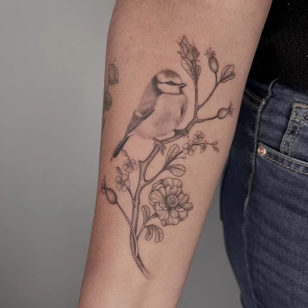 This delicate black and gray tattoo features a small bird perched on a flowering branch, beautifully etched along the forearm. The artist uses soft shading and fine lines to give the bird a lifelike presence, with intricate floral and bud details enhancing the natural theme.