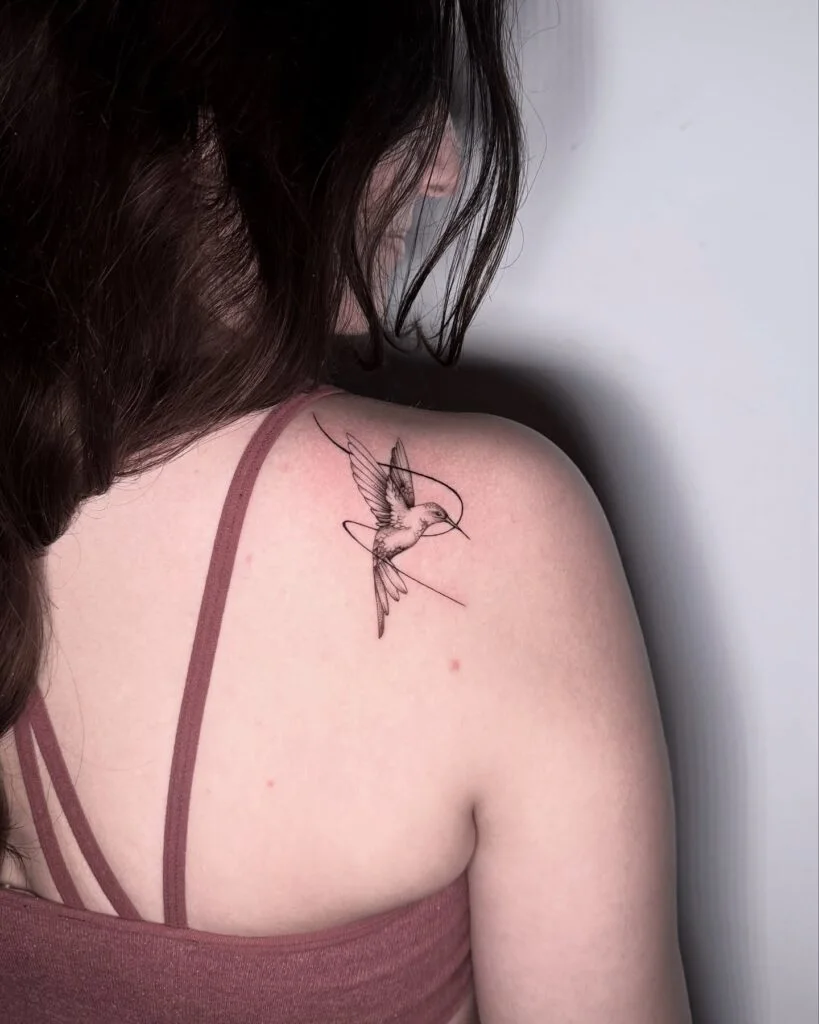 This delicate shoulder tattoo features a beautifully detailed hummingbird in flight, rendered in fine black and gray lines. Positioned just above the shoulder blade, the bird’s wings are captured mid-flap with a sense of motion, complemented by abstract swooping lines that add a graceful flow to the piece.