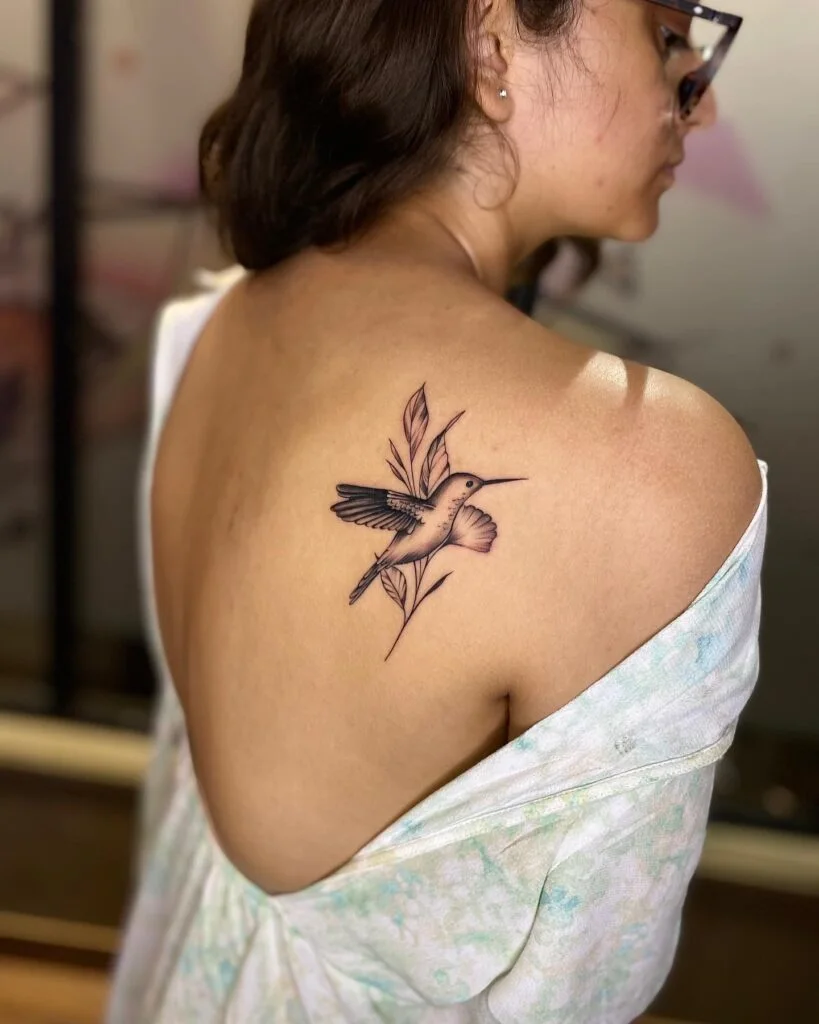 Hummingbird and Leaves Shoulder Blade Tattoo