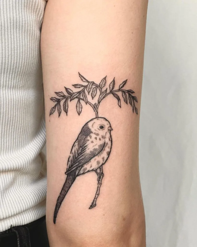 This whimsical tattoo features a long-tailed tit perched calmly on a small twig, with a leafy branch creatively growing from the top of its head like a crown. Rendered in fine black linework, the piece has a soft, almost storybook feel while maintaining delicate detail in the feathers and leaves.