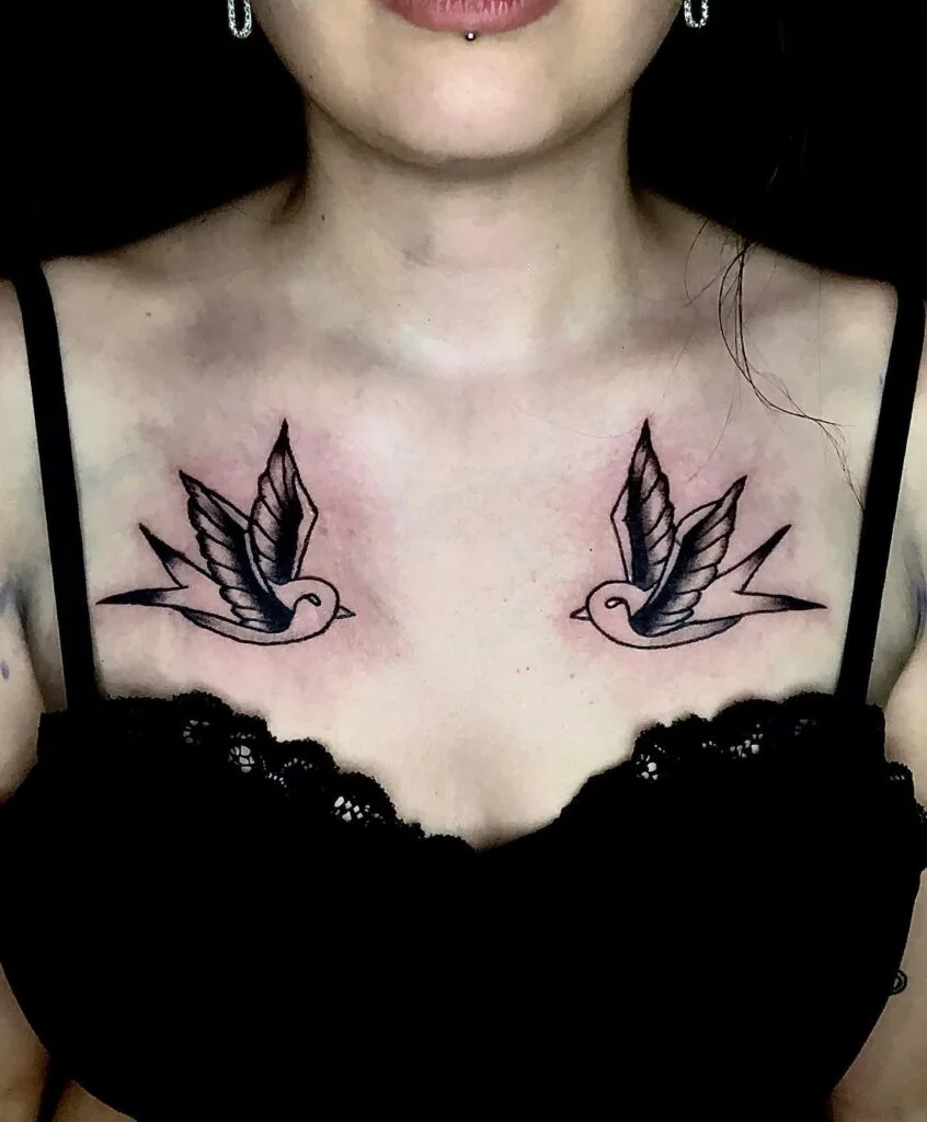 This symmetrical chest tattoo features two traditional-style swallows in mid-flight, positioned just below each collarbone. The birds are rendered in bold black lines with minimal shading, emphasizing their wings and tail feathers for a clean, timeless look.