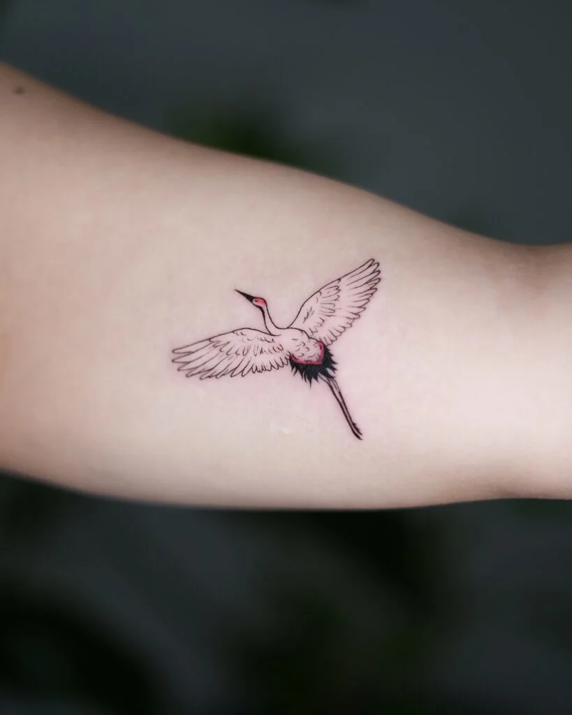 This elegant inner arm tattoo features a crane mid-flight, wings gracefully extended with soft shading and fine lines. Accents of red on the head and body give the piece a subtle yet powerful pop of color, enhancing the bird’s symbolic presence.
