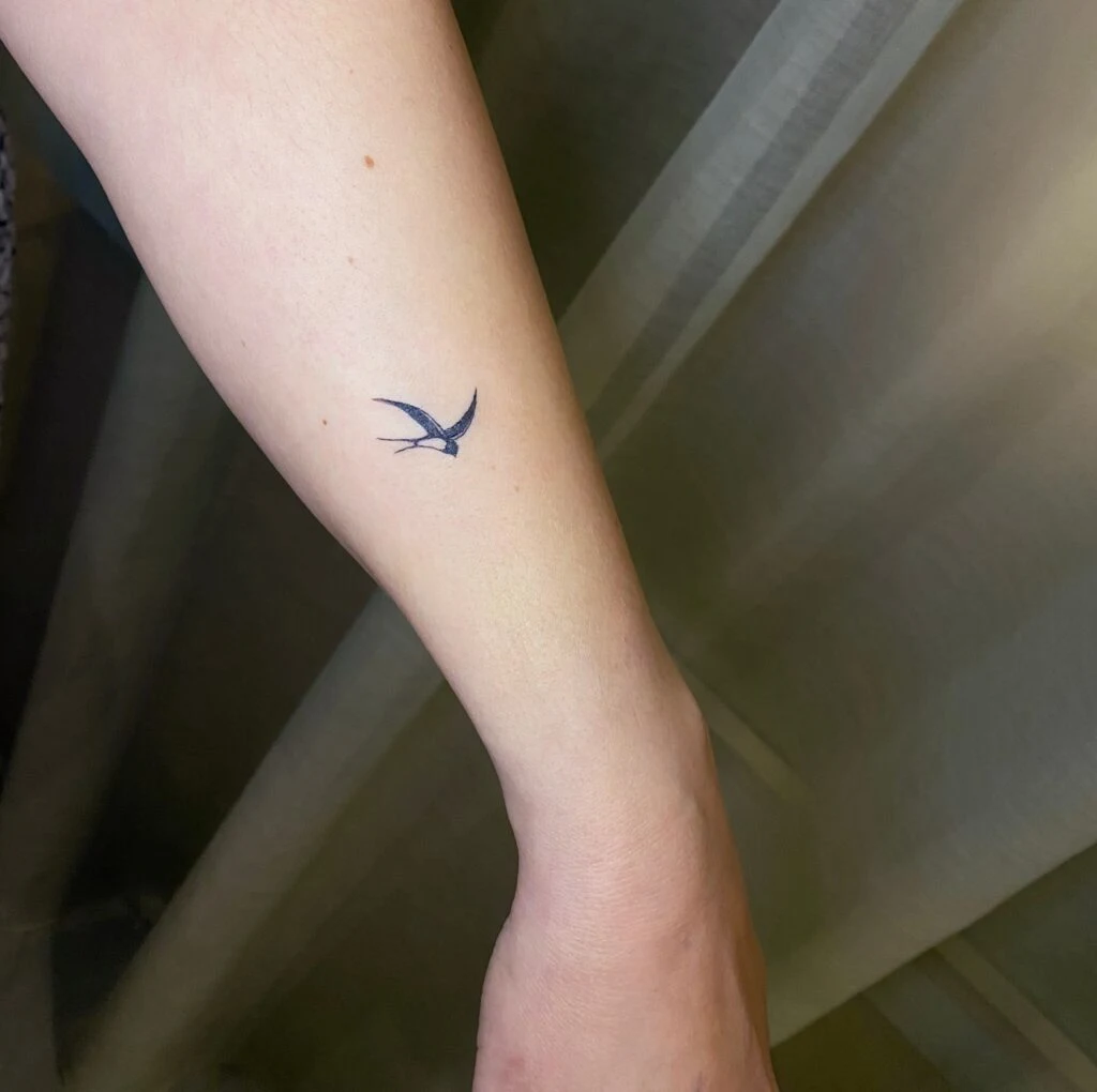 This minimal tattoo captures a graceful swallow in flight, delicately inked on the forearm. The clean, fine lines and compact size give it a refined and elegant feel.
