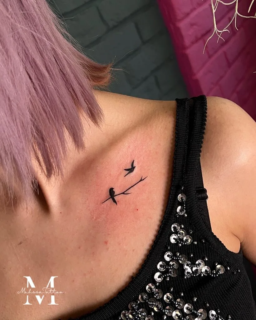 This dainty collarbone tattoo showcases a simple yet expressive design of two small birds—one perched on a thin branch, the other mid-flight. Done in clean black ink, the minimalist style highlights the freedom and companionship between the birds.