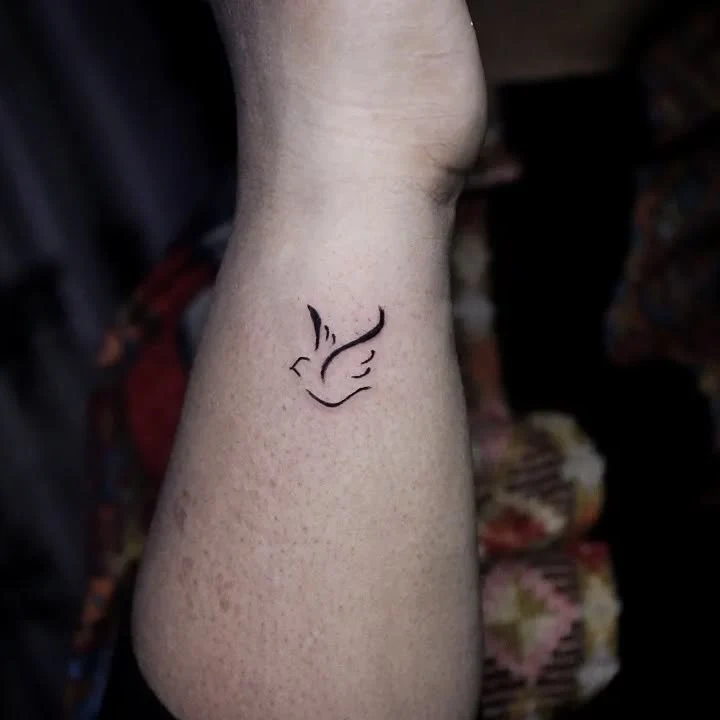 This simple yet powerful wrist tattoo features a minimalist outline of a flying bird in black ink. With only a few clean, flowing lines, the design captures the essence of freedom and peace.