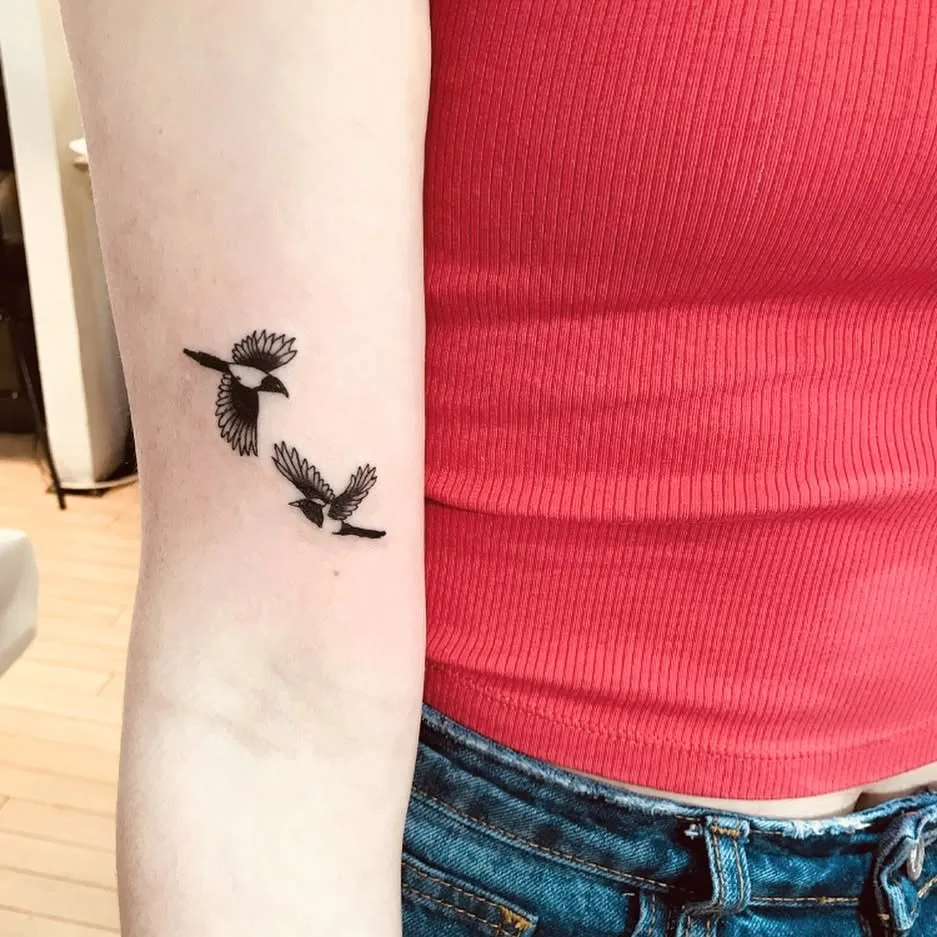 This striking forearm tattoo features two minimalist magpies in flight, done in bold black ink with clean, geometric wing patterns. The simplicity of the design enhances the graceful motion of the birds as they appear to glide in unison.