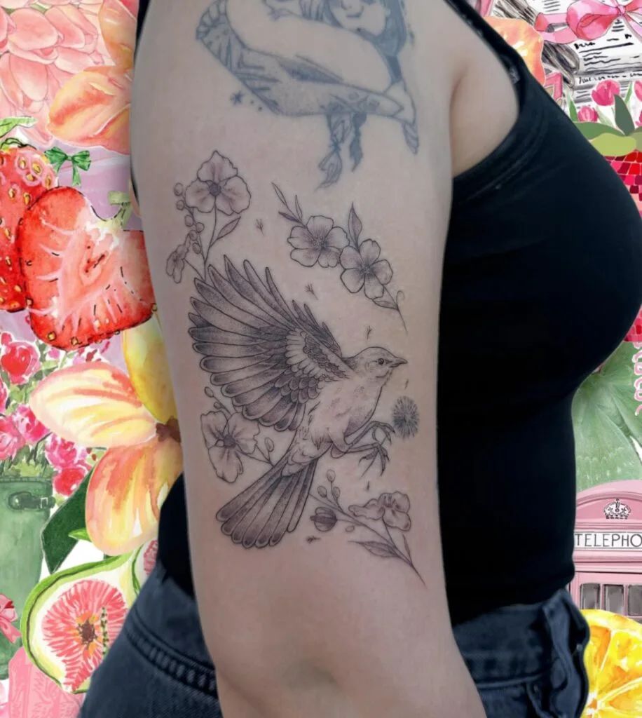 This black and grey tattoo features a bird resembling the iconic Mockingjay from The Hunger Games, soaring amidst delicate flowers and fine line detailing. The wings are spread wide in flight, showcasing soft shading and dynamic feather work.