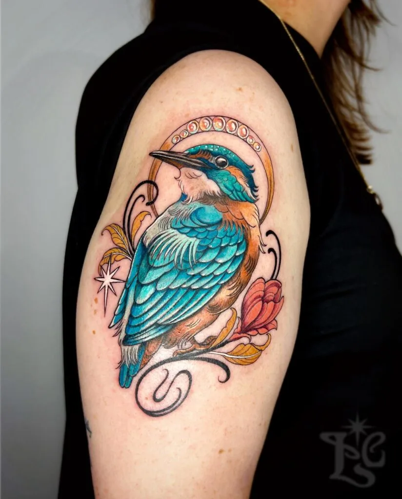 This stunning tattoo showcases a vibrant kingfisher perched among flowing ornamental florals, rich with teal, orange, and peach tones. Surrounding the bird’s head is a decorative halo featuring gem-like accents, giving it a regal, almost sacred aura.