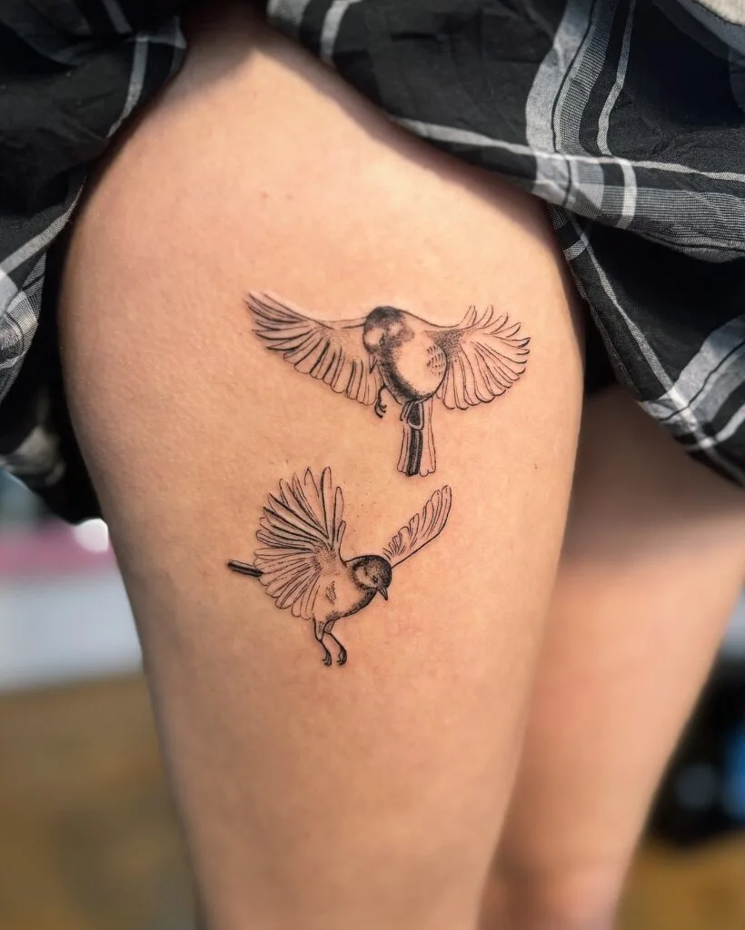 This tattoo features two small birds in graceful flight, delicately inked in black and grey on the upper thigh. Each bird is captured mid-air with wings spread wide, showcasing movement and symmetry.