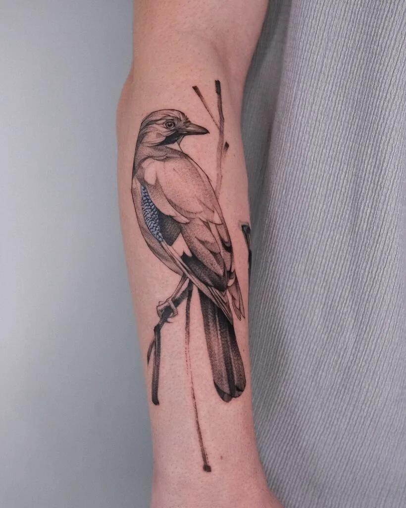This striking forearm tattoo showcases a detailed Eurasian jay perched on a thin branch, brought to life with fine black and gray shading and a subtle touch of blue. The precision in feather texture and the bird’s attentive gaze reflect its intelligent and observant nature.