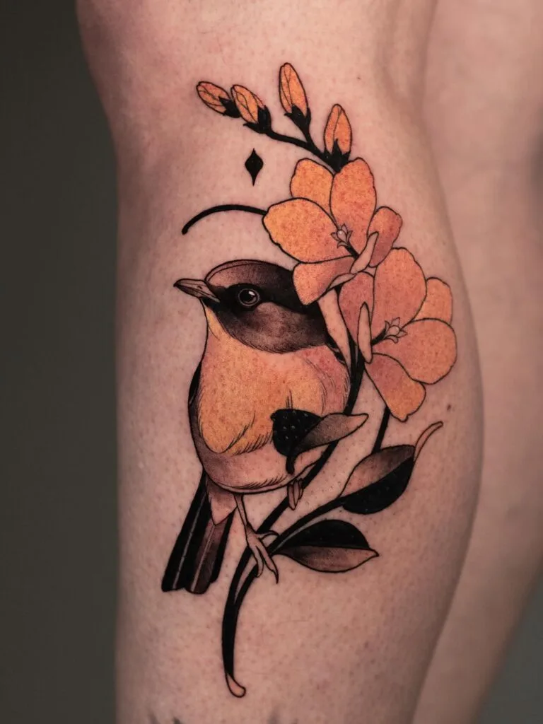 This charming tattoo features a small, soft-colored songbird nestled among blooming yellow-orange flowers. The detailed shading and gentle gradient tones give the bird a warm and lifelike presence, while the black linework adds definition and contrast.