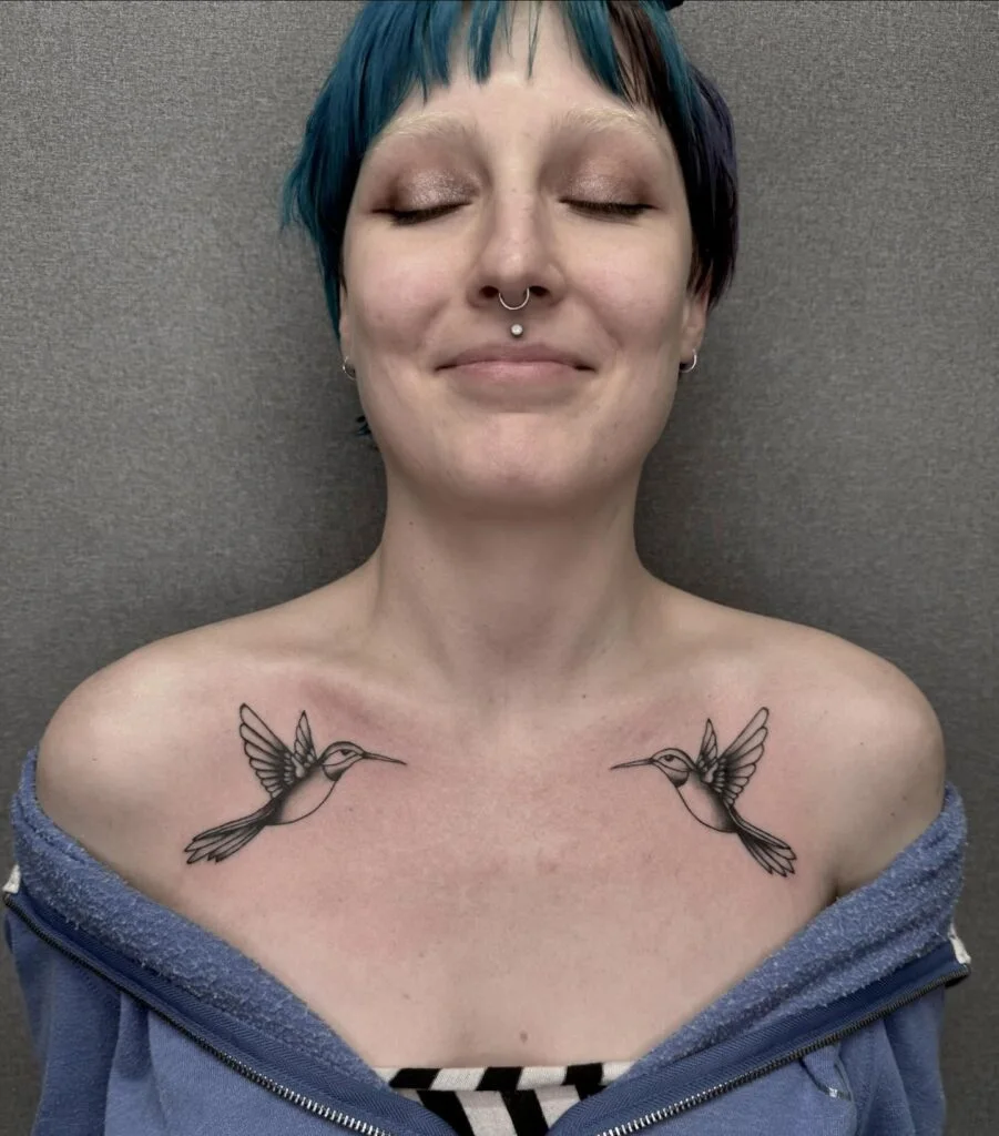 This beautiful tattoo features two finely detailed hummingbirds, each placed gracefully near the collarbones. The birds face inward, as if captured mid-hover, with wings lifted and beaks extended in perfect balance.