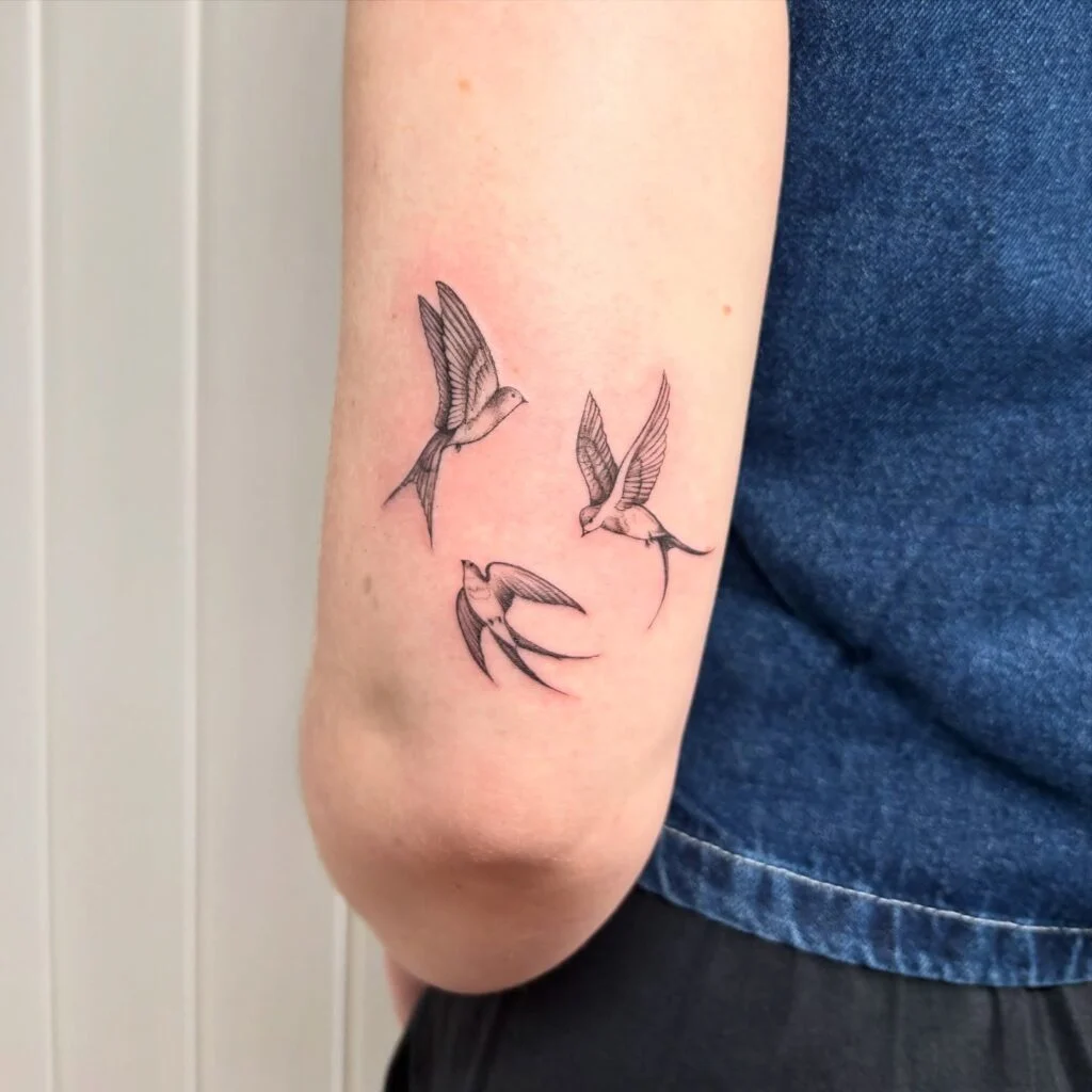 This delicate tattoo features three finely inked swallows in flight, each captured in a different motion across the back of the upper arm. Rendered in soft black and gray linework, the birds symbolize freedom, hope, and safe journeys.