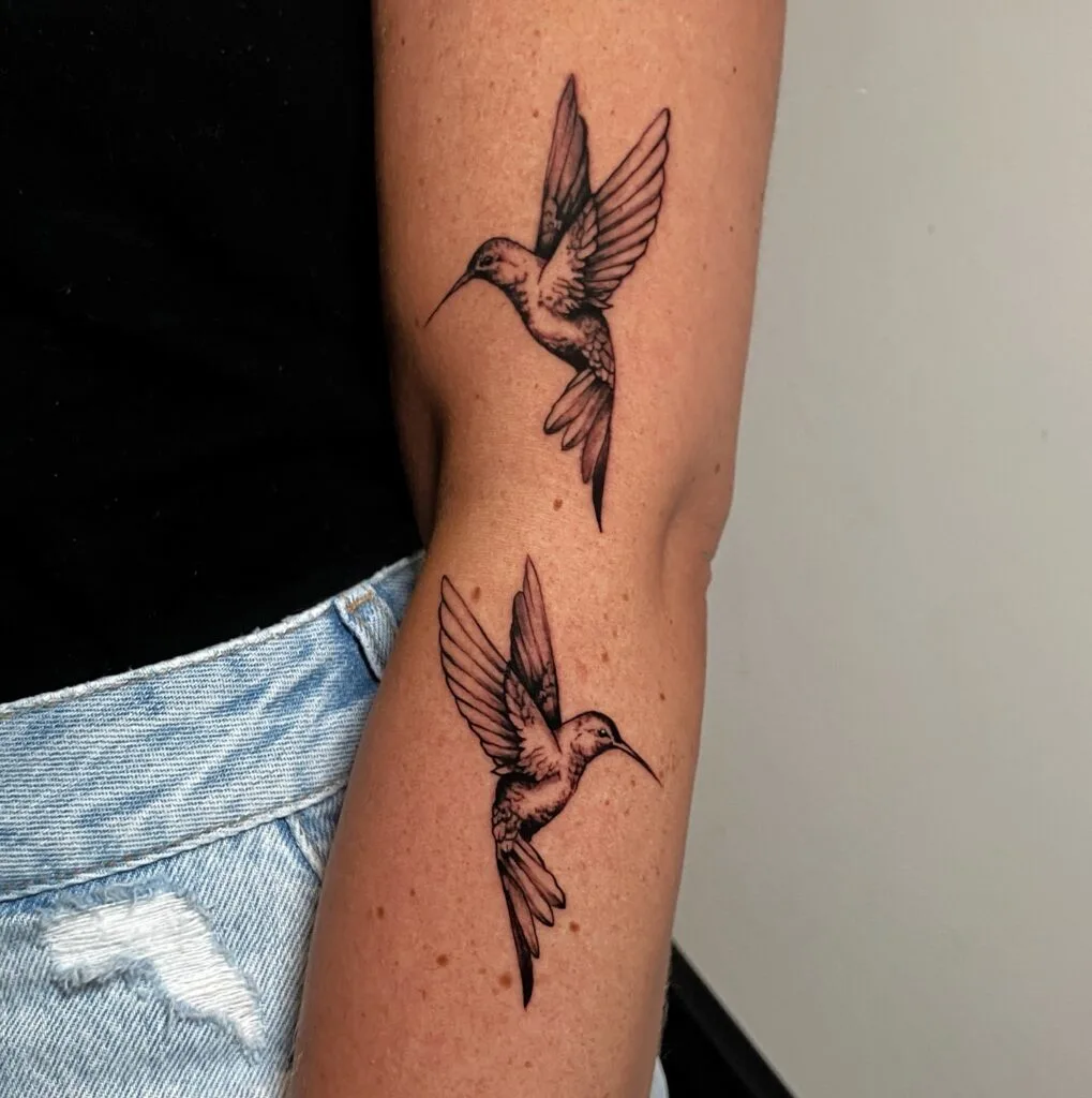 This charming tattoo features two hummingbirds in flight, inked on the outer arm just above and below the elbow. The black and gray shading emphasizes their slender wings and delicate form, capturing their light, swift movement.