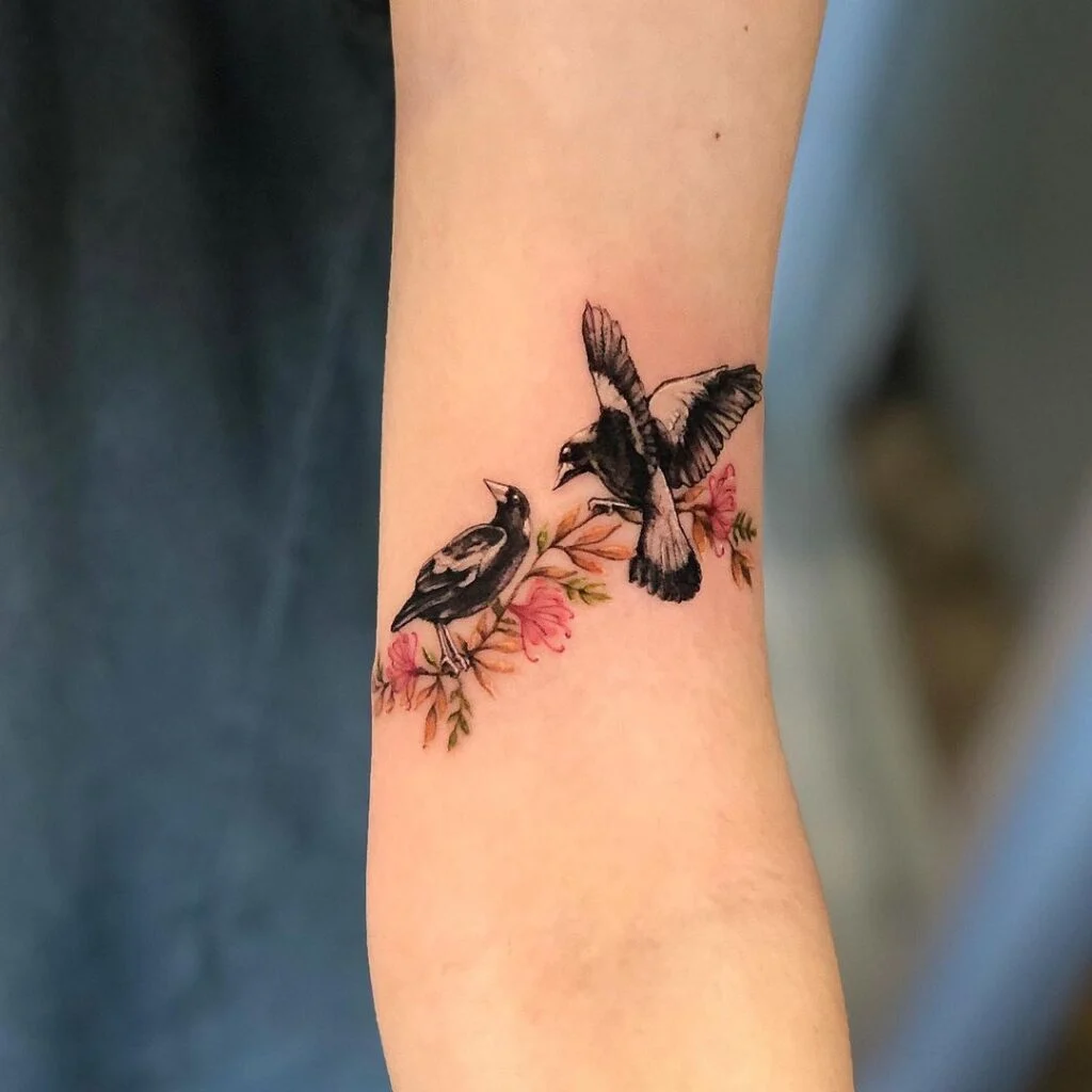 The use of soft pinks and warm foliage enhances the charm and balance of the black-and-white birds. This design wraps gently around the forearm, symbolizing connection, communication, and perhaps a special bond between two people. It’s a beautiful choice for nature lovers or those who appreciate meaningful pairings.
