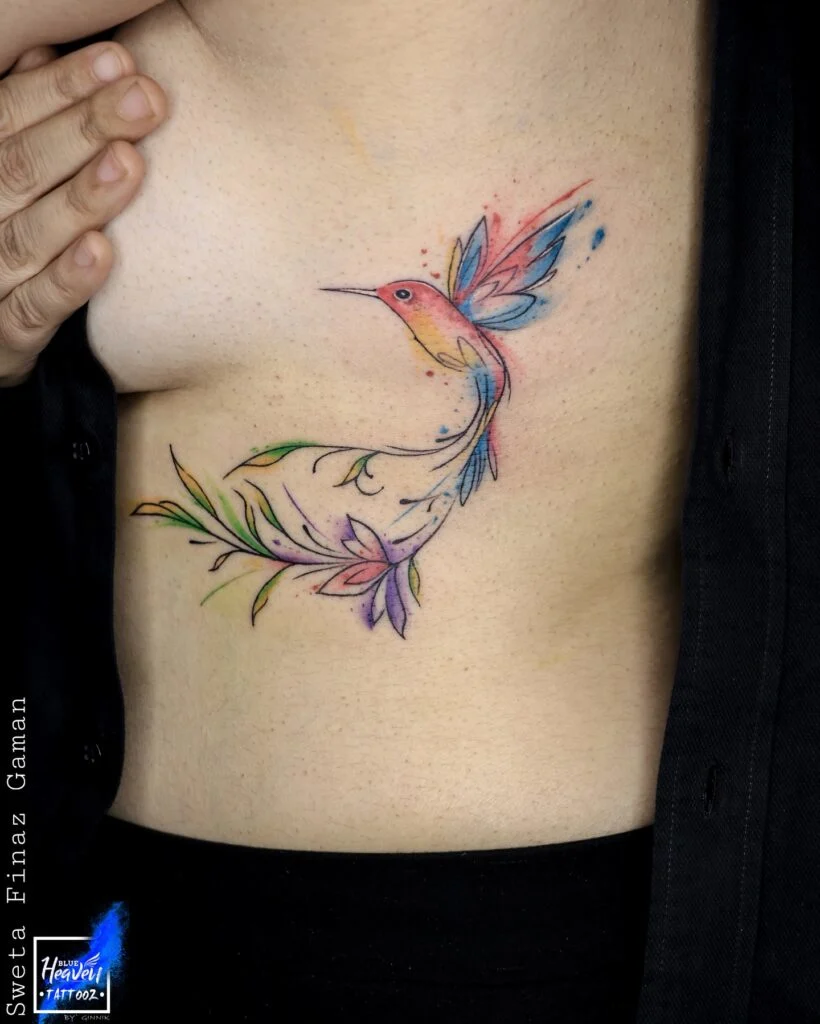This stunning tattoo captures a hummingbird in mid-flight, crafted with a flowing watercolor style that feels light and ethereal. Bursting with vibrant colors—pinks, blues, purples, and yellows, the hummingbird blends into abstract floral elements that trail behind like motion lines.