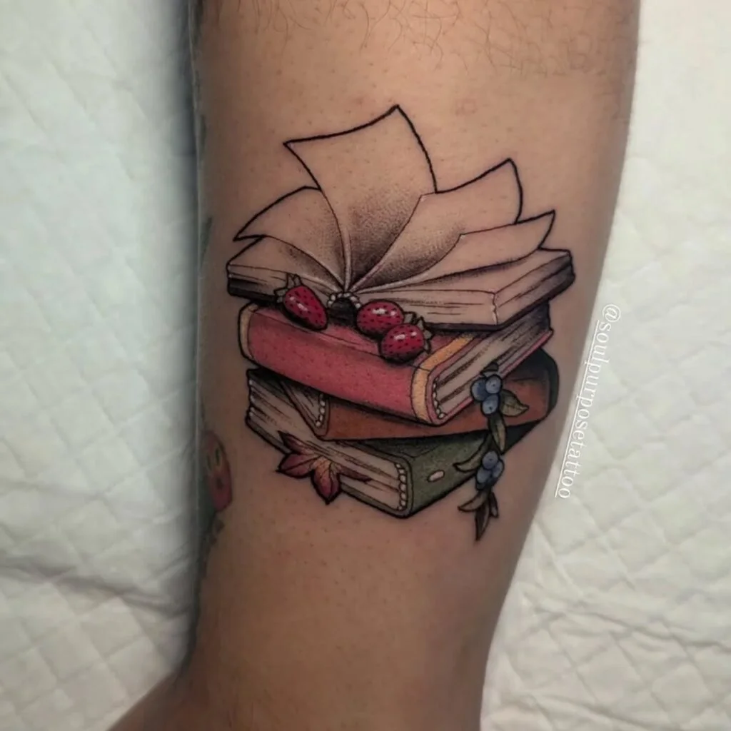 This playful and cozy tattoo shows a small stack of colorful books, with strawberries and blueberries resting sweetly on top.