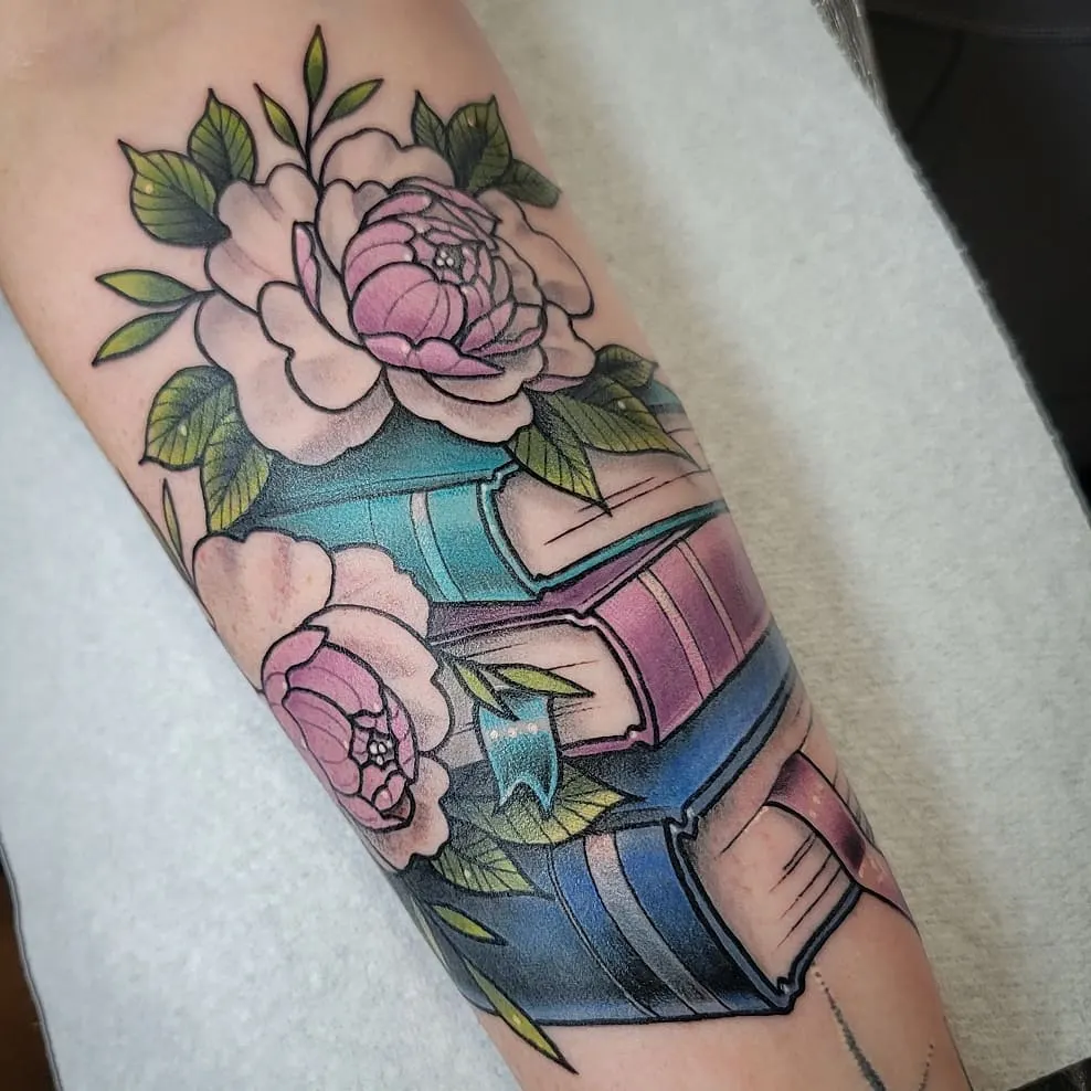 This vibrant tattoo features a stacked collection of books in bold blues, purples, and pinks, beautifully surrounded by blooming peonies. The flowers frame the books with lush leaves and soft pink petals, adding contrast and elegance to the structured forms.