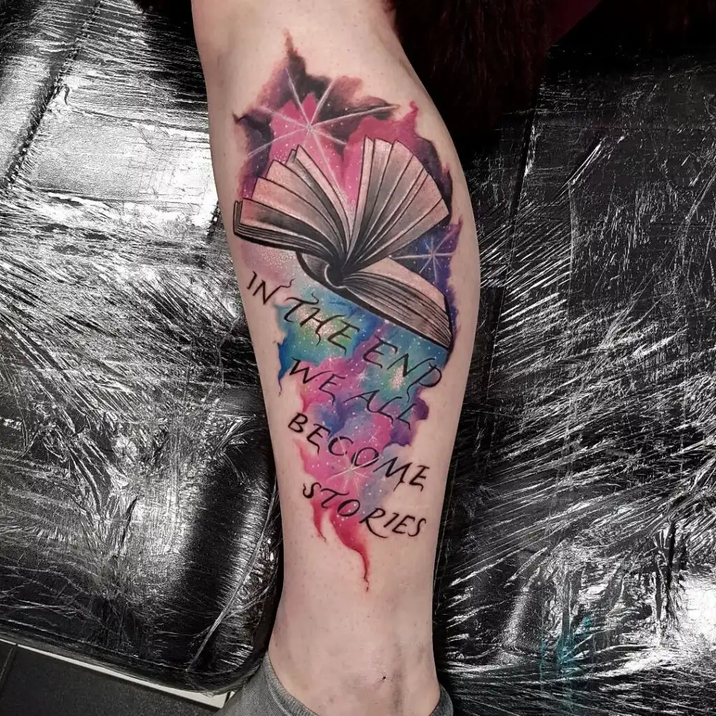 Sparkles and whimsical lines add to the magical energy, suggesting the power of stories to transport us beyond reality. With its playful yet meaningful design, this tattoo beautifully symbolizes how imagination, color, and wonder rise from the pages we read—turning knowledge into something cosmic and limitless.