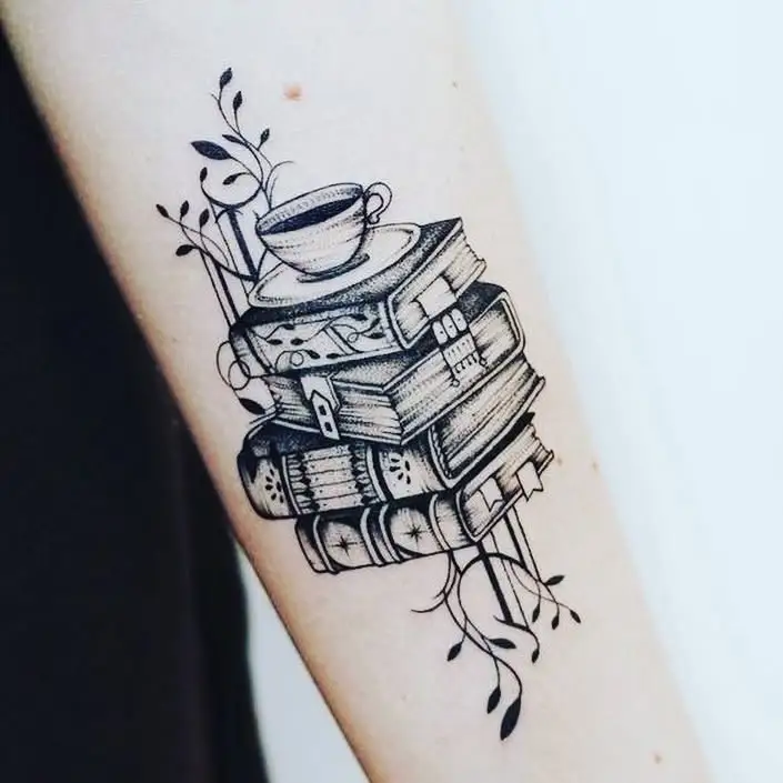 This charming tattoo features a detailed stack of books, crowned by a teacup and saucer, with delicate leaves growing around the arrangement. Each book has unique detailing, evoking antique volumes filled with stories and secrets.