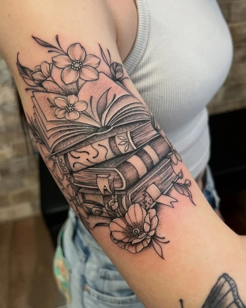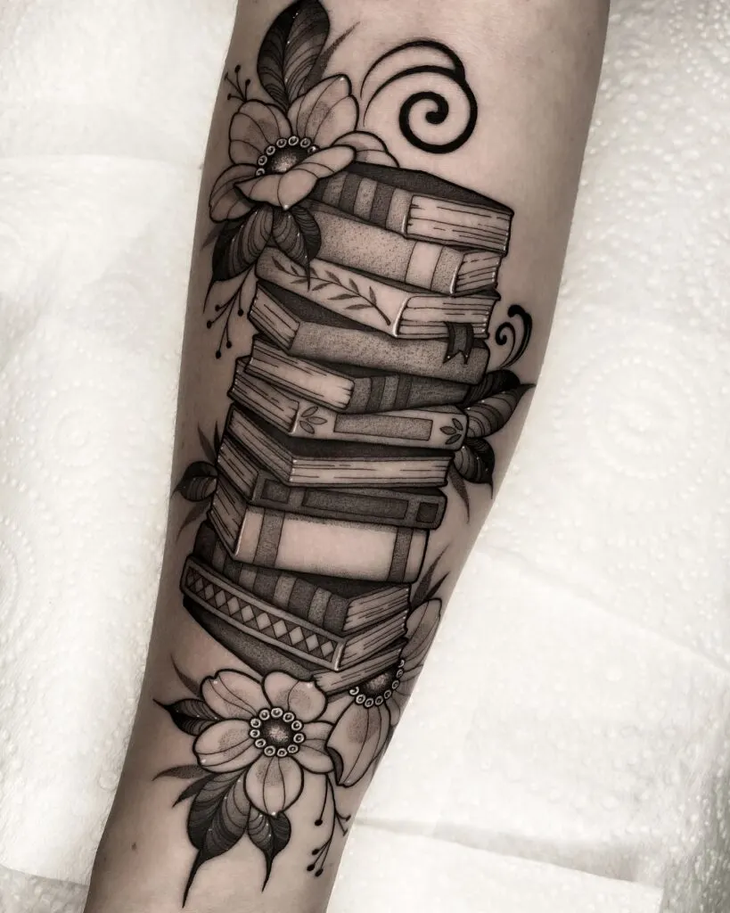 This dramatic tattoo features a towering stack of books wrapped in bold, ornamental flowers and swirling decorative lines. The shading is rich and dark, creating depth and contrast that make the books and petals pop.