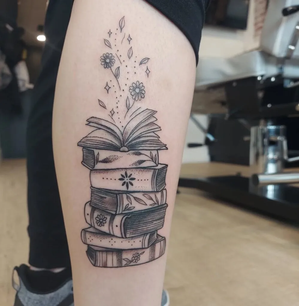 This tattoo shows a stack of vintage books with an open one on top, surrounded by delicate leaves and small sparkling stars. The intricate linework adds a soft, natural feel, symbolizing the growth and enlightenment that comes from reading.