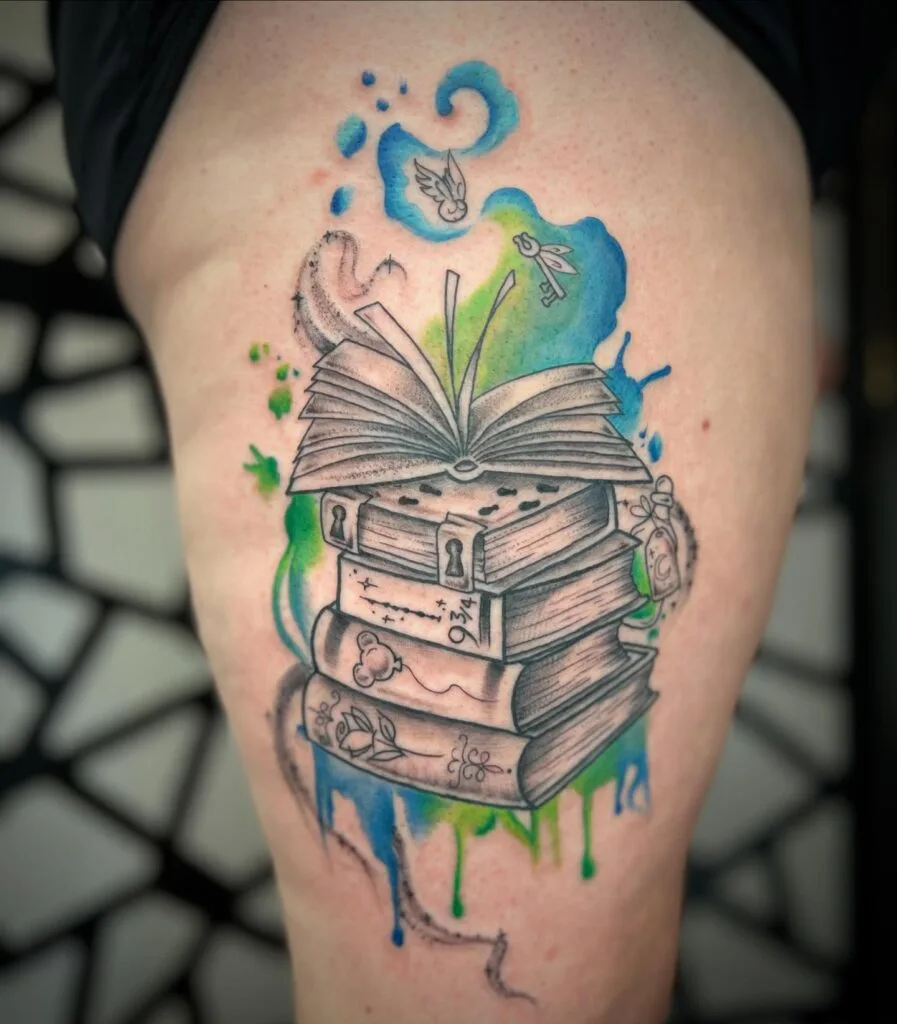 This dynamic tattoo combines grayscale book illustrations with a bold splash of watercolor-style blue and green. A stack of enchanted books—featuring keyholes, platform 9¾, and whimsical symbols—sits at the center.
