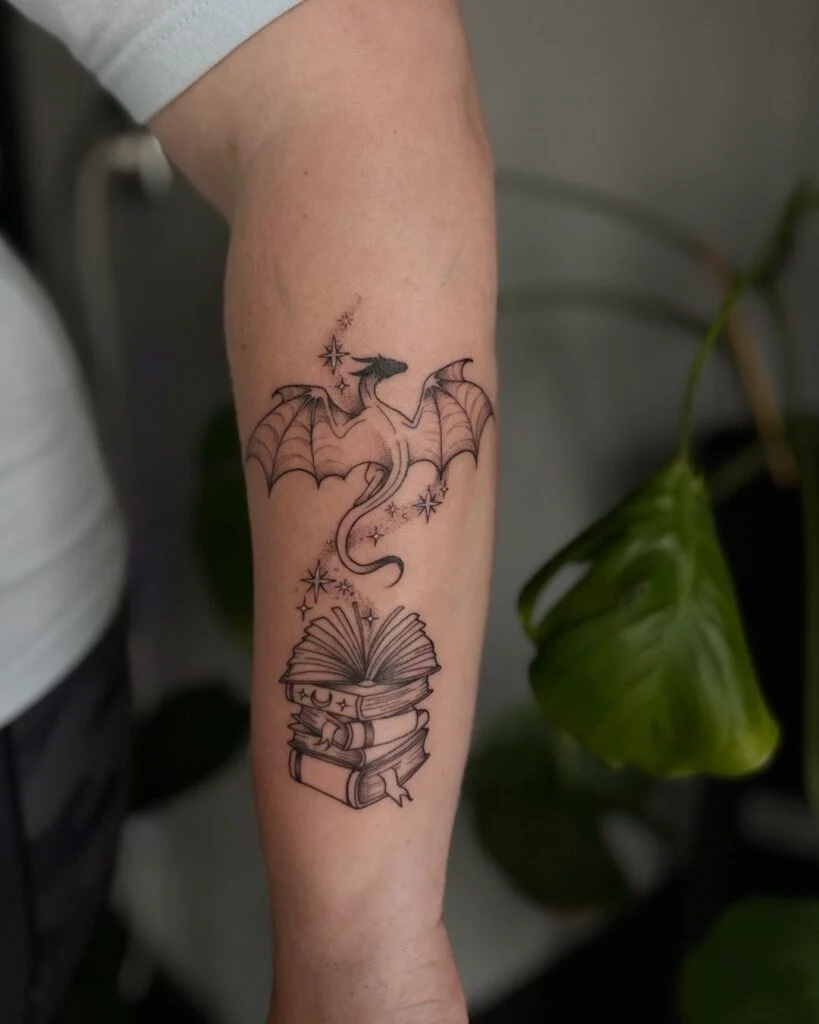 This tattoo features an open book at the bottom, from which several small dragons emerge, flying upwards in different directions. The design symbolizes the escape into fantastical realms that books provide, where dragons and mythical creatures come to life.
