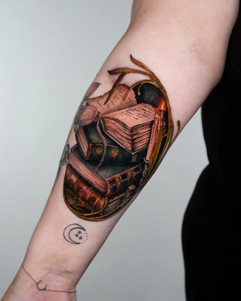This richly detailed tattoo presents a realistic stack of antique books, with aged pages, embossed covers, and warm earthy tones. A scroll drapes around the books, entwined with botanical elements that add movement and elegance.