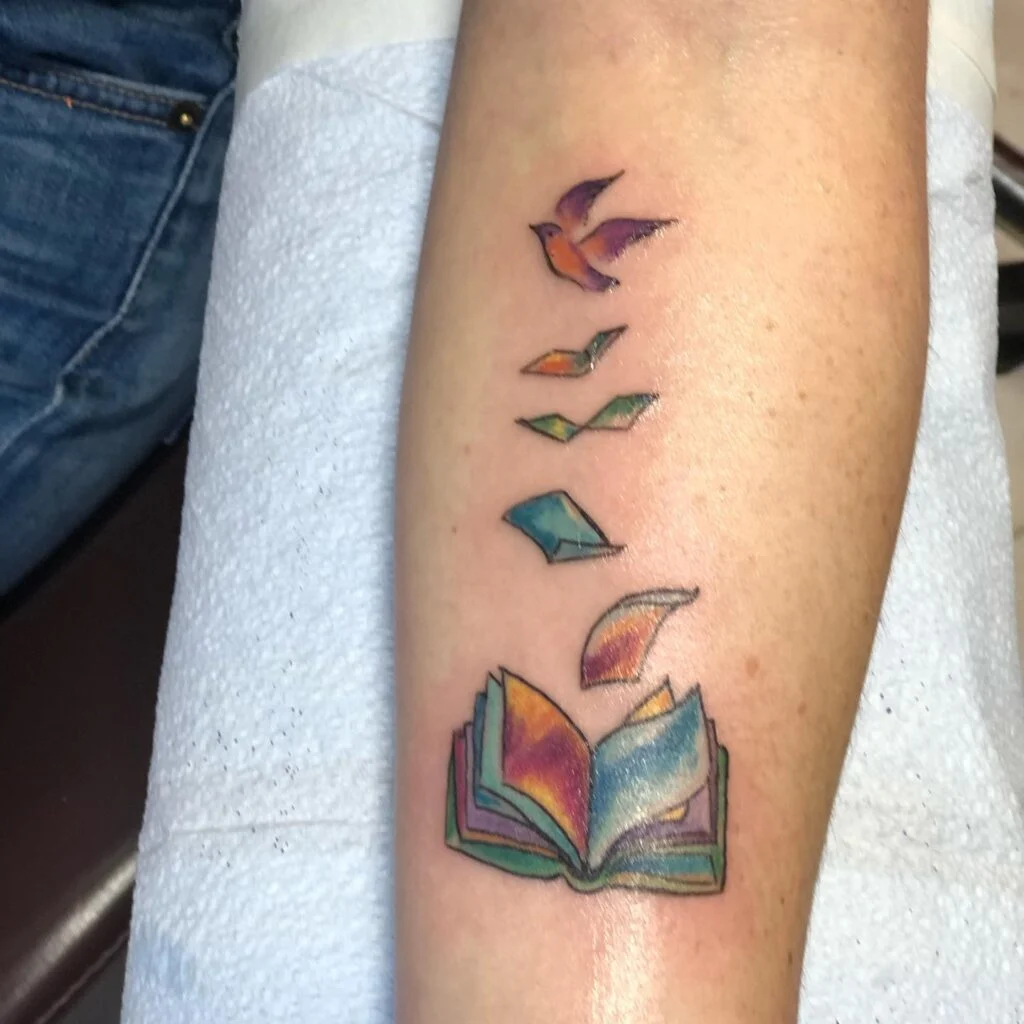 This vibrant and symbolic tattoo shows an open book with its pages transforming into origami-like shapes that gradually become a soaring bird. The design flows upward along the forearm, capturing a sense of freedom and transformation.