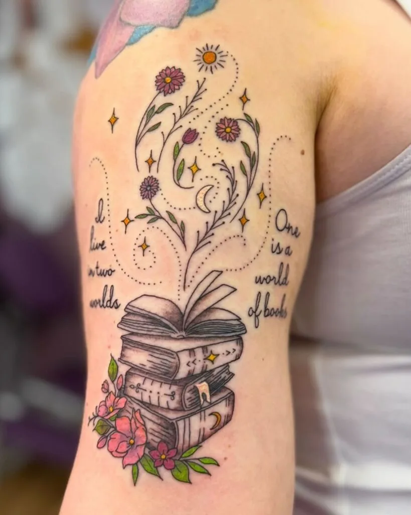 This tattoo displays a vibrant stack of books intertwined with a stunning array of colorful flowers. The mix of pink, orange, and yellow blossoms, like peonies and poppies, bursts from the open book, symbolizing the growth and beauty that stories can inspire.
