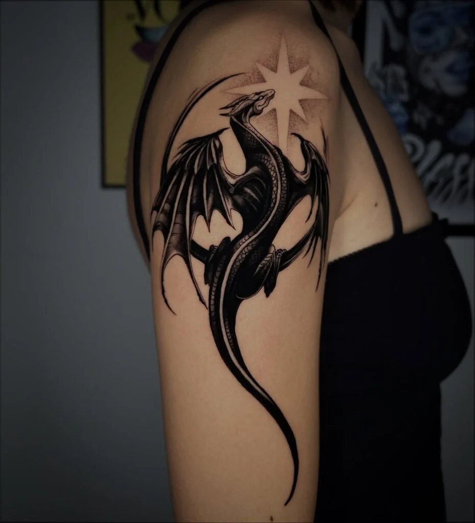 This tattoo depicts a fierce black dragon extending across the upper arm, wings spread wide in a bold pose.
