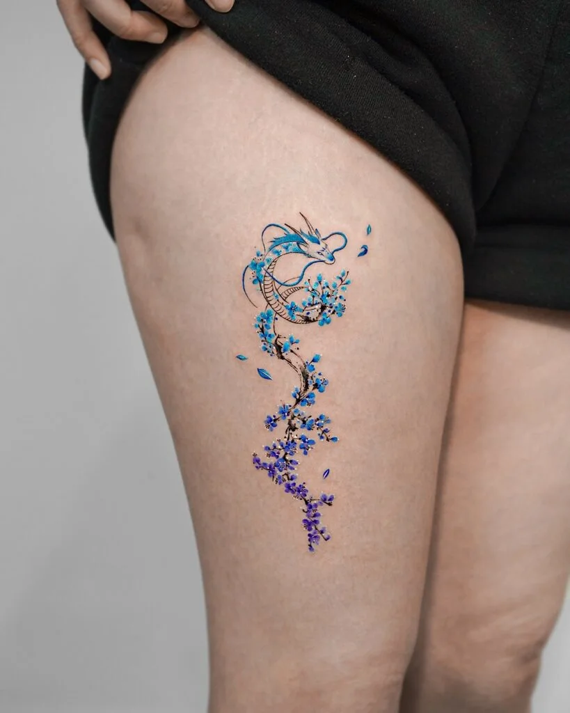 This tattoo shows a delicate dragon winding gracefully around a blossoming branch decorated with vivid blue and purple flowers.