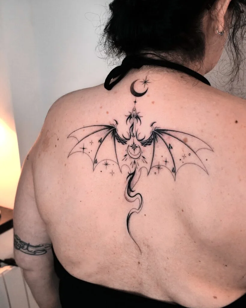 This tattoo shows a dragon with wide wings extended across the upper back, surrounded by moons and stars.