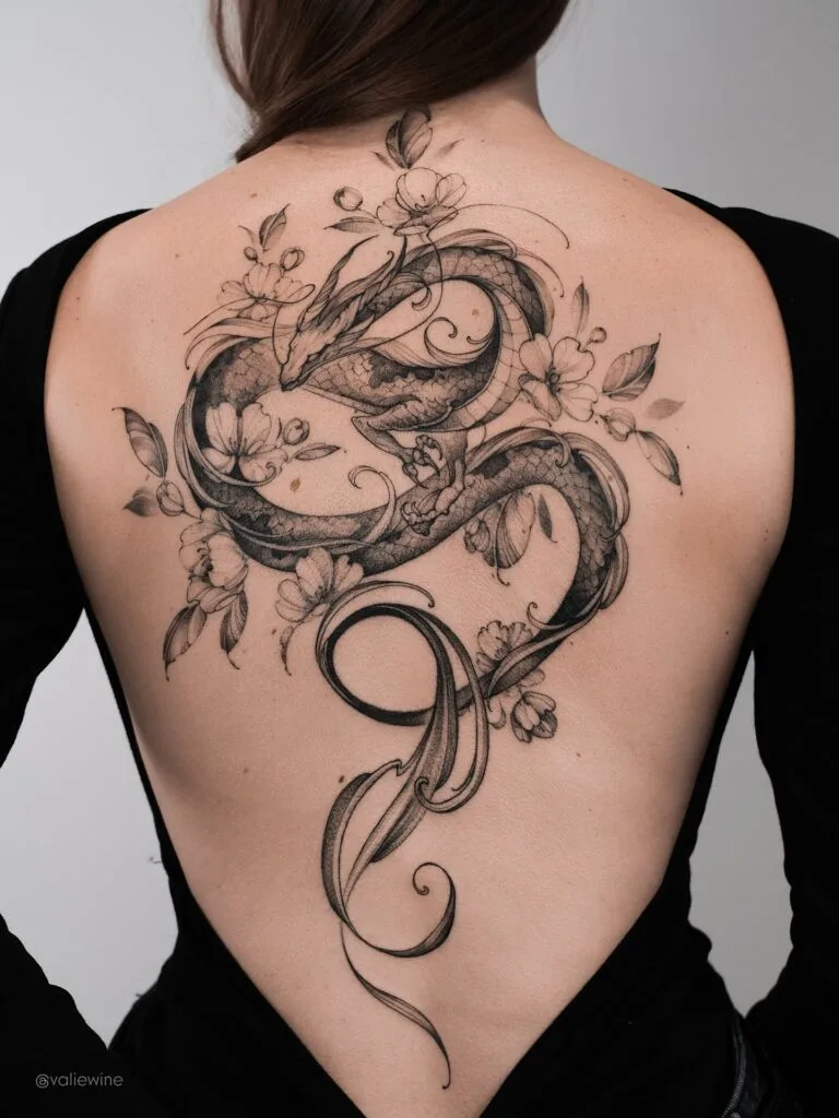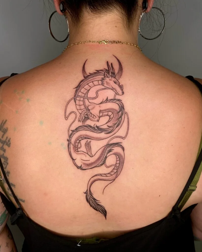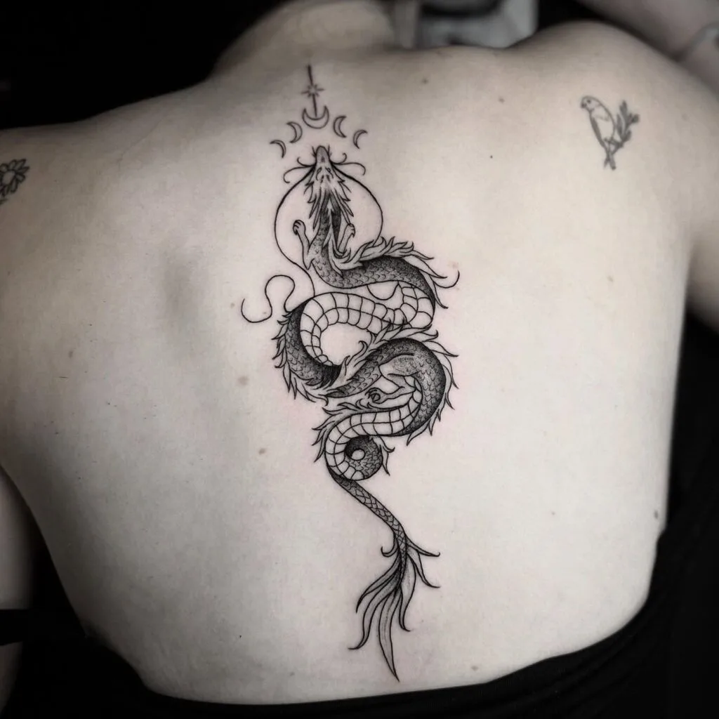 This tattoo features a dragon coiled gracefully along the spine, its body detailed with fine scales and flowing curves.