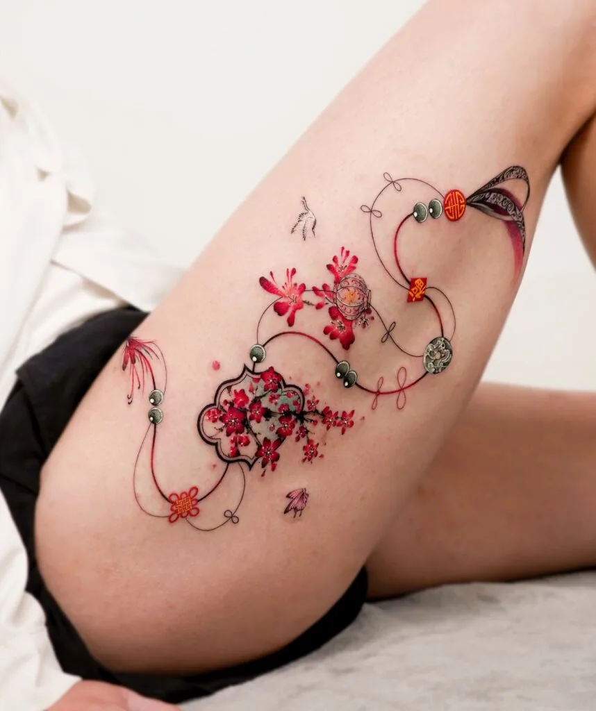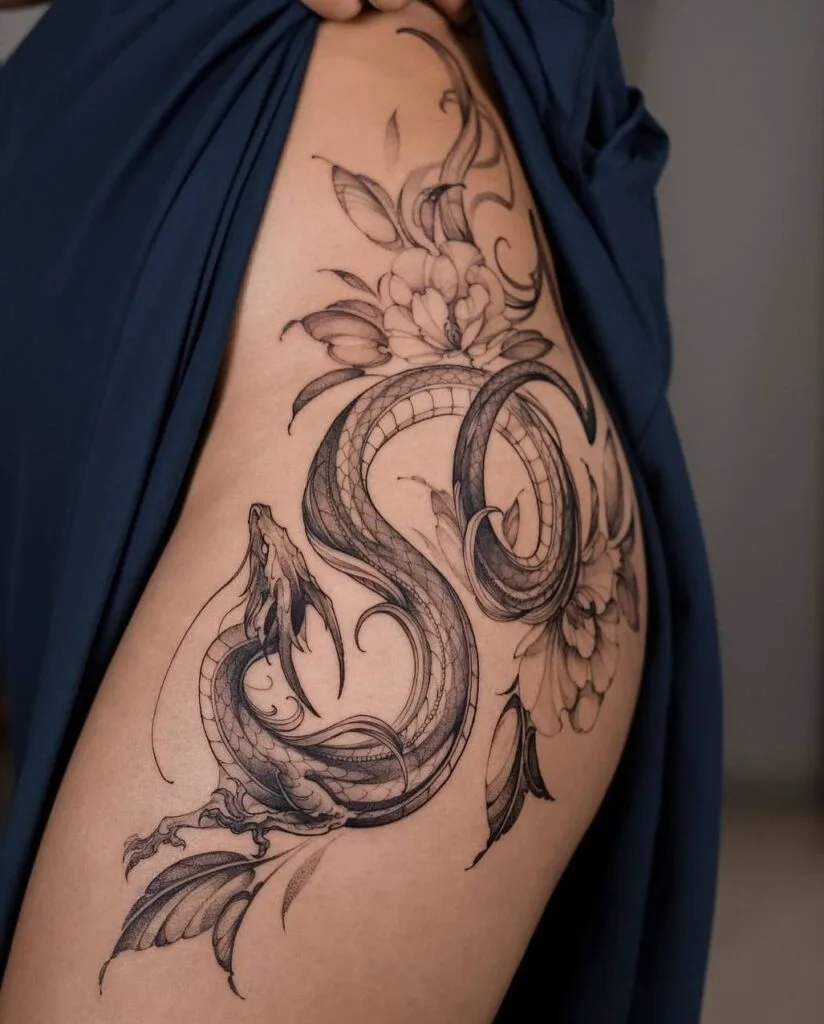 The placement on the thigh gives the tattoo a bold presence while allowing space for intricate composition. Flowing lines tie the dragon and flowers together, making the design dynamic, elegant, and visually captivating.