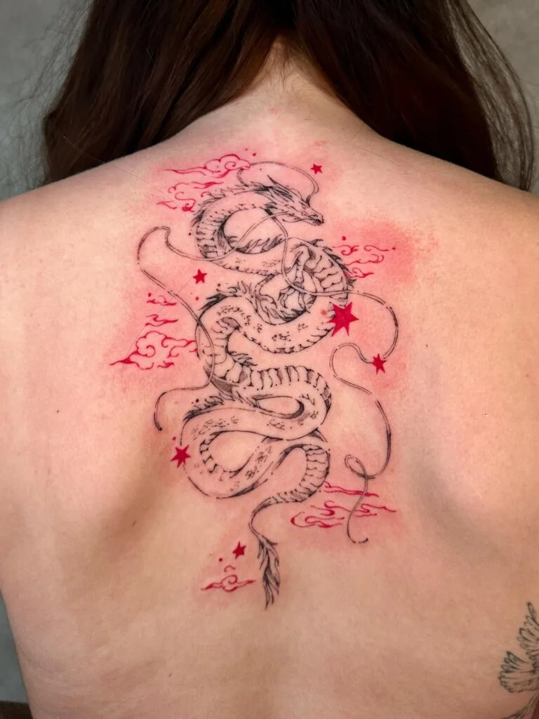 The dragon’s body twists dynamically down the upper back, its form detailed yet light, emphasizing fluidity over heavy shading. The addition of red elements creates striking contrast, making the tattoo bold while maintaining a balanced composition.
