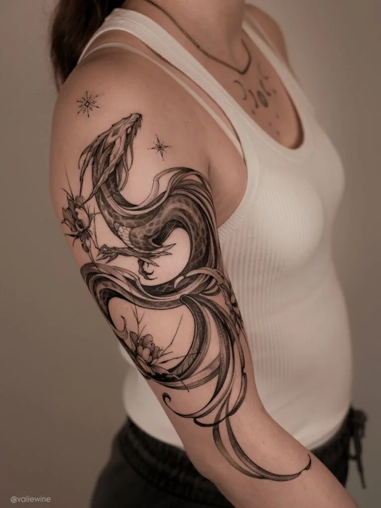 Fine lines highlight both the scales and floral details, creating balance between strength and elegance. The long, feather-like tail curves downward, enhancing movement across the arm.